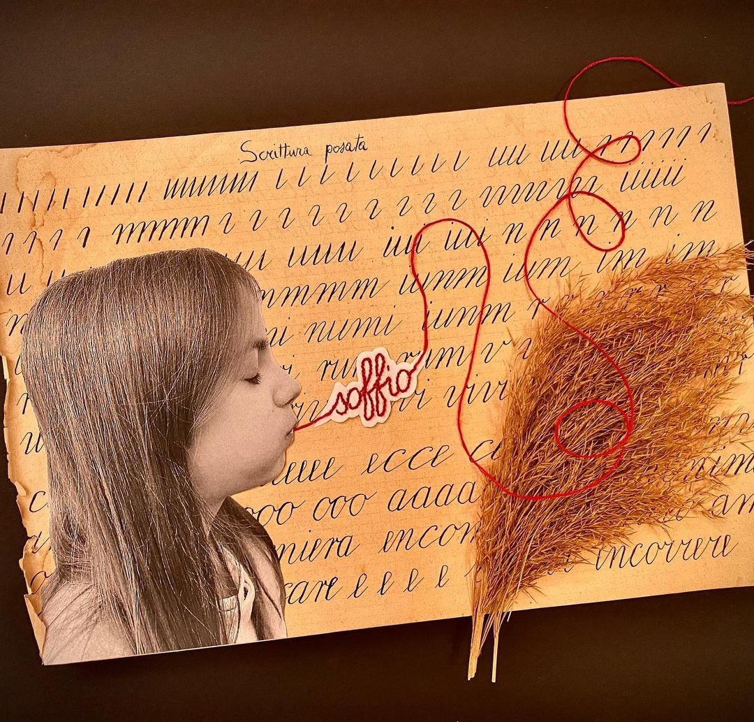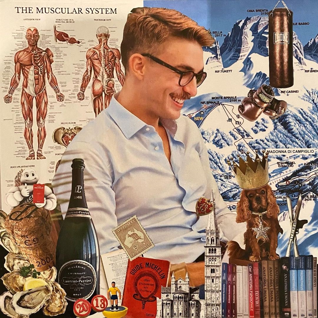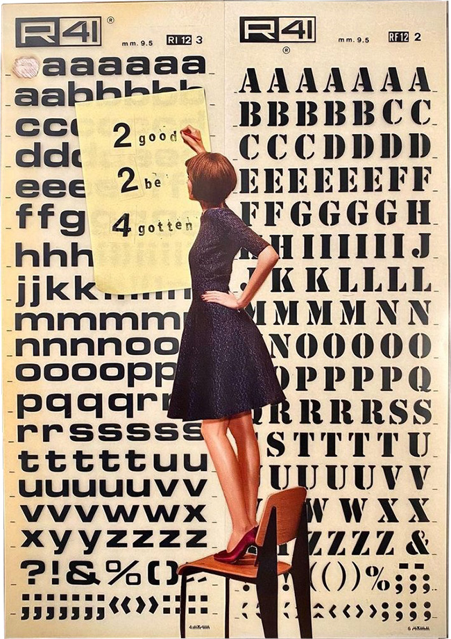 Con abbinamenti a volte assurdi e immagini contrastanti, il mio collage vuole colpire al cuore giocando, sorprendere rovistando fra i ricordi, e infine farsi riconoscere strappando un sorriso.